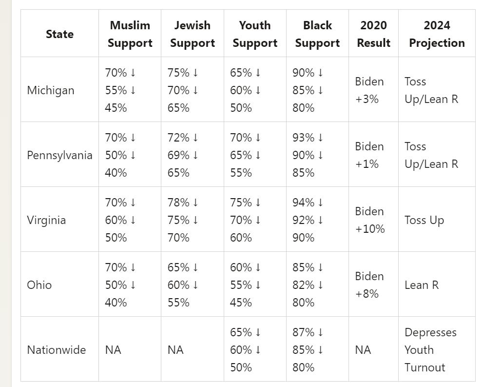 Around 70% of Muslim voters supported Biden in 2020, but his unwavering Israel backing amidst civilian deaths triggered anger [6]. Polls indicate approval could plummet to 55% [7]. In battleground states like Michigan, Pennsylvania, Virginia, and Ohio with sizable Muslim populations, many feel their vote is taken for granted [8]. Youth are especially disenchanted with Biden's failure to push for a ceasefire or acknowledge Palestinian suffering [9]. Even minor swings could shift tight races in 2024.