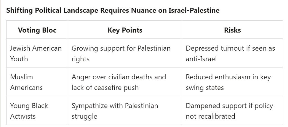 Failure to acknowledge emerging attitudes risks depressing turnout among engaged youth blocs. But pivoting risks alienating moderate pro-Israel constituents. The president will need exceptional political poise to maintain enthusiasm and mainstream allegiance. ⚖️